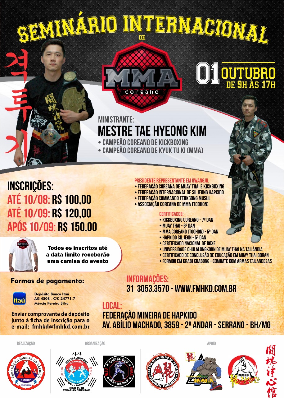 A Federação Mineira de Hapkido trás as Minas Gerais diretamente de Gwangju – Coréia do Sul, o Mestre Tae Hyeong Kim para ministrar o Seminário Internacional de MMA Coreano - Kyuk Tu Ki - Too Hon.