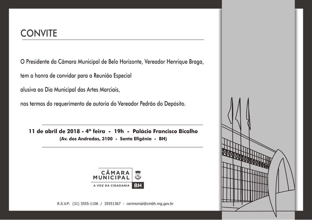 O Presidente da Câmara Municipal de Belo Horizonte, Vereador Henrique Braga, tem a honra de convidar para o Reunião Especial alusiva ao Dia Municipal das Artes Marciais, nos termos do requerimento de autoria do Vereador Pedrão do Depósito