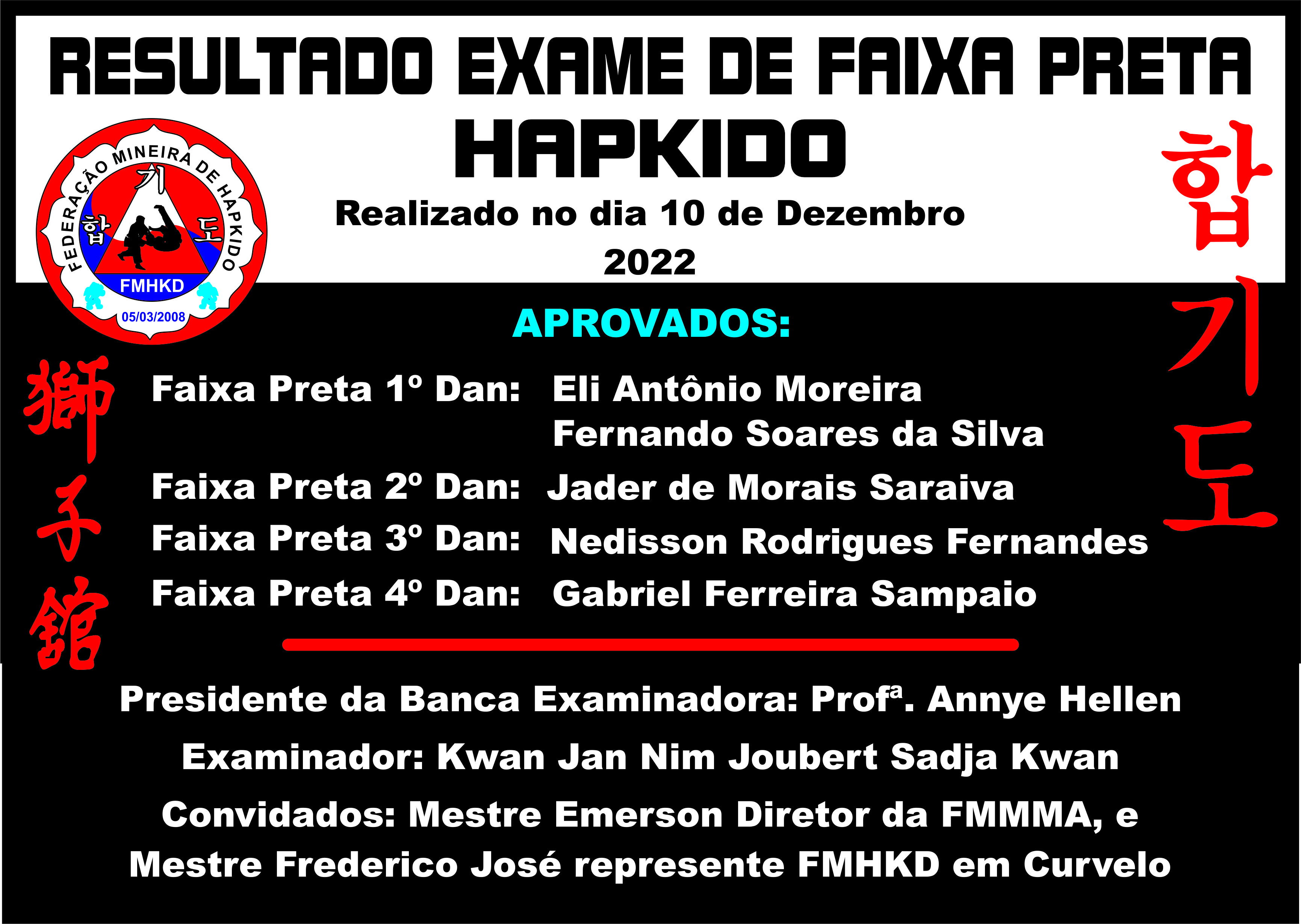 No dia 10 de Dezembro de 2022, foi realizado o Exame de Faixa Preta de Hapkido na Sede da Federação Mineira de Hapkido (Academia Sadja Kwan)
